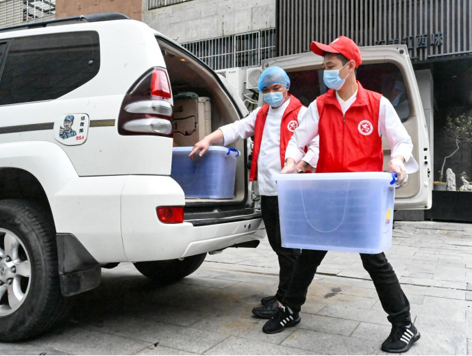 3月18日,在泉州市丰泽区,餐饮店的商家在运送爱心午餐。新华社记者周义摄