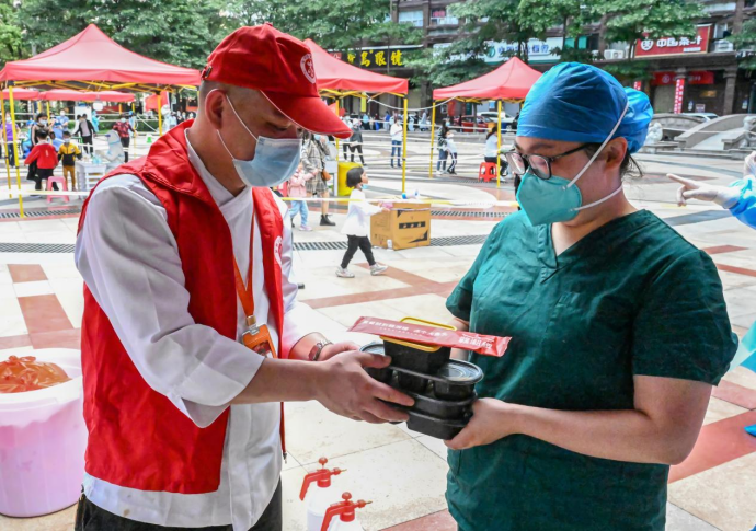3月18日,餐饮店志愿者在泉州市丰泽区一处核酸检测点发放爱心午餐。新华社记者周义摄