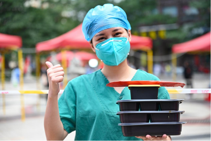3月18日,在泉州市丰泽区一处核酸检测点,医务人员拿着爱心午餐向镜头点赞。新华社记者周义摄