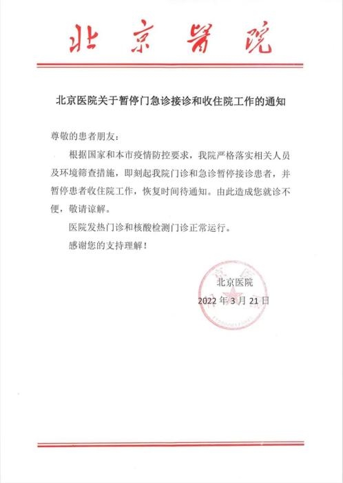 据北京医院微信公众号21日消息,根据国家和北京市疫情防控要求,该医院严格落实相关人员及环境筛查措施,即刻起该医院门诊和急诊暂停接诊患者,并暂停患者收住院工作,恢复时间另行通知。发热门诊和核酸检测门诊正常运行。通知如下: