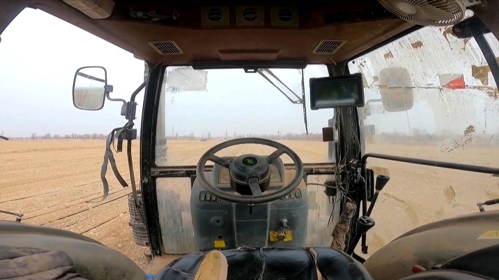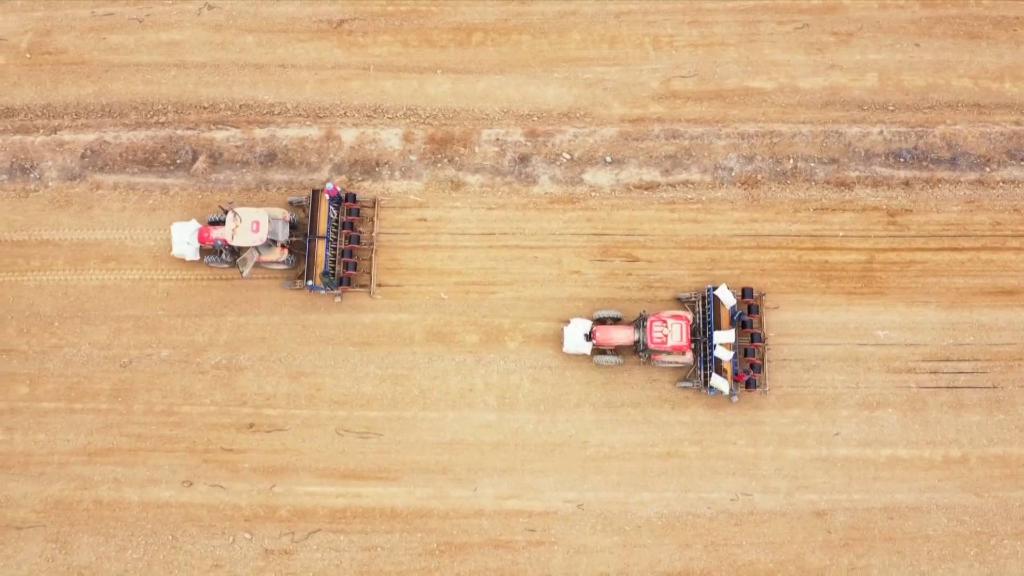 在玛纳斯县乐土驿镇,田地里装有北斗导航系统的无人驾驶精量播种机,按照预先设定的播种线路精量播种。播种、铺设滴灌带实现全程机械化。