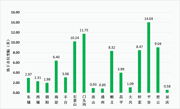 这是今年3月中旬与2021年同期对比,北京市各区地下水水位变幅柱状图。(北京市水务局供图)
