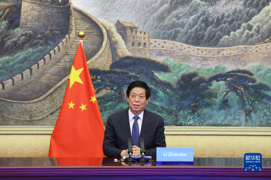 3月22日,全国人大常委会委员长栗战书在北京人民大会堂以视频方式同克罗地亚议长扬德罗科维奇举行会谈。新华社记者 姚大伟 摄