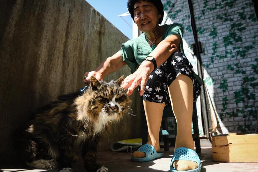 2017年9月14日,南京大屠杀幸存者王素明在南京家中阳台上为猫梳理毛发。新华社记者李响摄