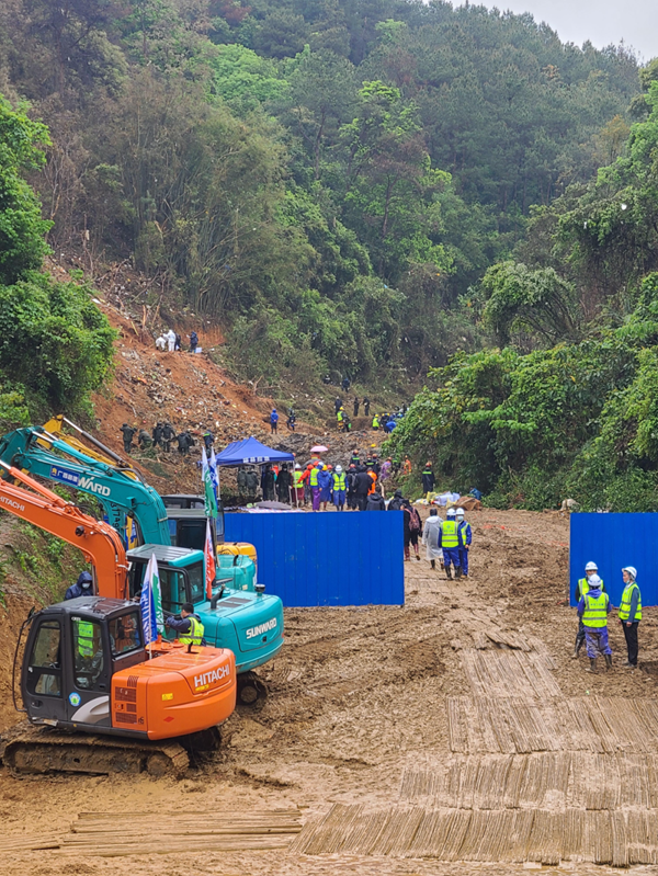 记者在现场看到,持续降雨导致路面泥土松软黏稠,一些地方出现积水,人员行走不便,救援人员送来竹架板铺在地上,以增大鞋面与地面的摩擦,防止打滑,便于救援工作顺利开展。在事故现场核心区域,挖掘机等设备已准备就绪。