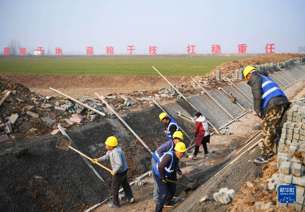 在河南省鹤壁市浚县30万亩高标准农田示范方内,施工人员在修复去年水毁的沟渠(2月24日摄)。新华社记者 张浩然 摄