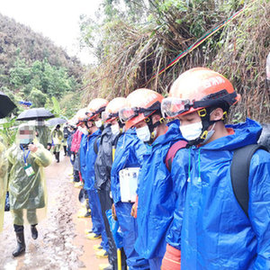 3月24日,在距离东航坠机事故地点400米的山道上,消防救援人员在行进途中遇到前往现场的失联乘客家属,他们肃立在道路一旁,向家属行礼。