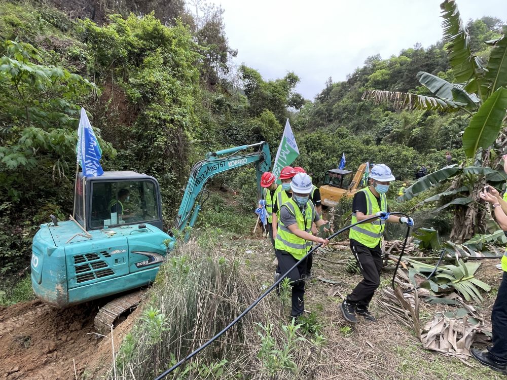 由于事故现场位于山林间,进入现场的通道狭窄,3台挖掘机进场清除杂树杂草,拓宽前往核心现场的道路。道路畅通后,更多的救援人员集结进场,全力搜救。