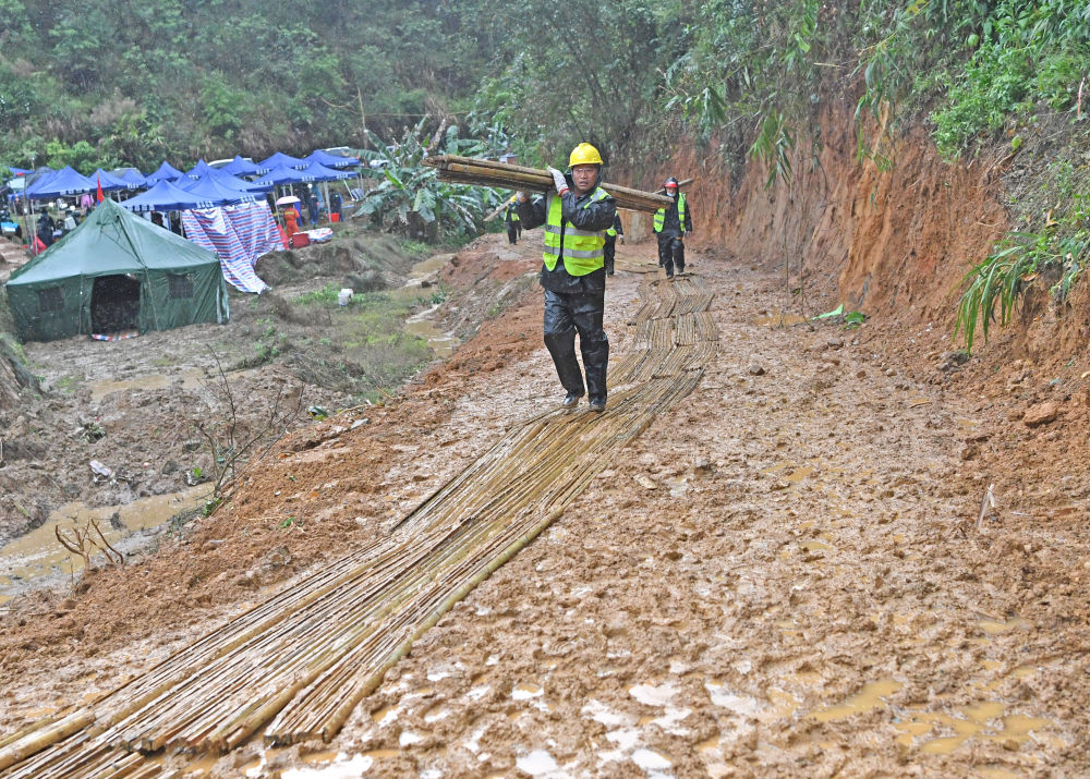 ↑3月23日,工作人员在坠机事故现场搬运铺设道路的竹排。新华社记者 周华 摄