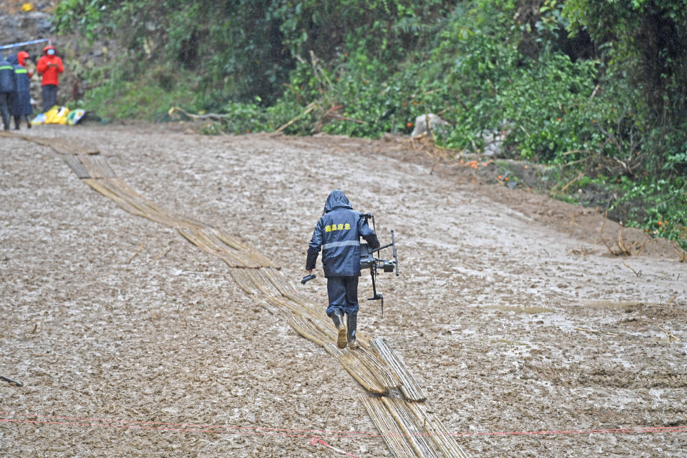 救援人员除了携带铁锹外,还带了便携探测设备和几只搜救犬,对事故核心现场及两边山坡进行搜索。搜救人员手持热成像仪、生命探测仪等设备进行表层搜索和热量搜索,此外人工搜索和空中无人机搜索同步推进,大家都在为搜寻尽心尽力。