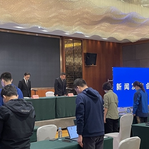 新闻发布会现场,大家全体起立,为遇难者默哀。