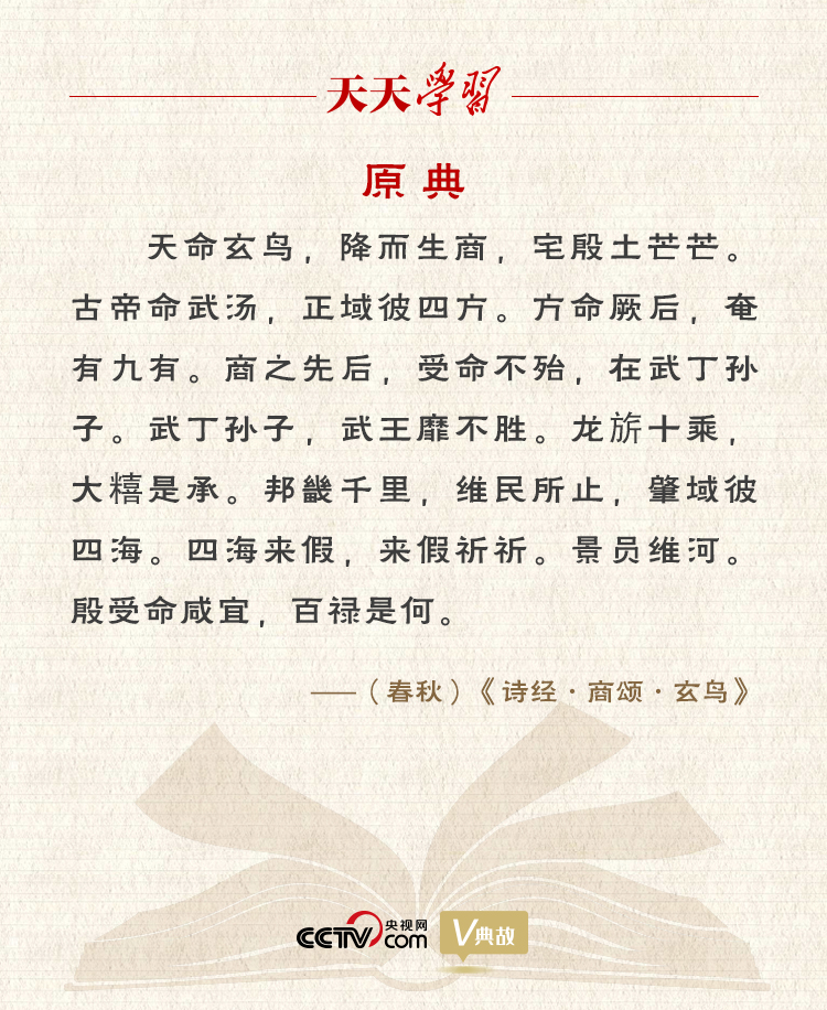 《诗经·商颂·玄鸟》是商族后裔祭祀自己祖先的乐歌。诗歌开篇以“玄鸟生商”作为商人后裔关于自身民族起源的神话叙事,接着讲述了殷商先祖的赫赫武功(如:商汤“正域彼四方”,“奄有九有”;武丁继承商汤大业,开拓疆土,以至“邦畿千里,维民所止,肇域彼四海”),最后以“殷受命咸宜,百禄是何”收尾。