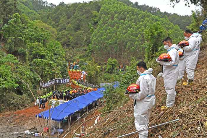 3月27日14时许,哀悼活动开始,全场鸣笛,“3·21”东航MU5735航空器飞行事故国家应急处置指挥部全体人员、事故现场搜救人员等面向遇难飞机方向肃穆而立,默哀三分钟,以此寄托对遇难者的哀思。