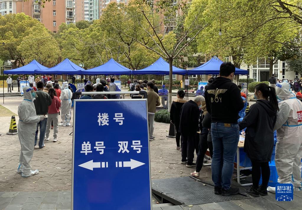 3月28日,在浦东新区花木街道联洋年华园小区一处核酸检测点,居民排队接受核酸采样。新华社发
