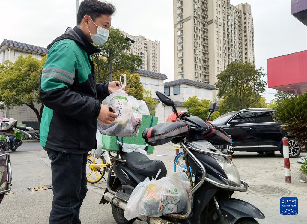 3月28日,浦东新区三林镇一小区外,外卖员为居民运送蔬菜。新华社记者 吴振东 摄