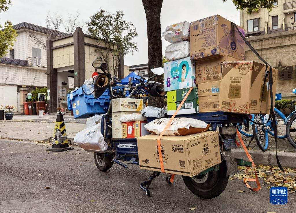 这是3月28日在浦东新区三林镇一小区外拍摄的满载居民订购物资的外卖电动车。新华社记者 吴振东 摄