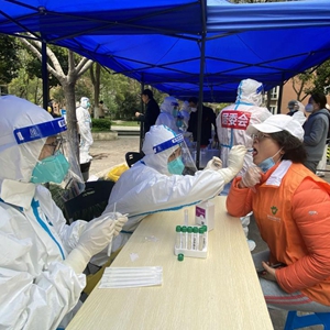 3月28日,在浦东新区花木街道联洋年华园小区一处核酸检测点,居民在接受核酸采样。新华社发