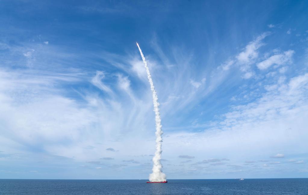 2020年9月15日9时23分,我国在黄海海域用长征十一号海射运载火箭,采取“一箭九星”方式将“吉林一号”高分03-1组卫星送入预定轨道,发射获得圆满成功。新华社记者 才扬 摄