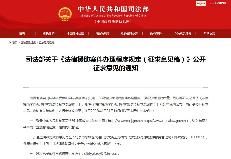 《中华人民共和国法律援助法》已经自2022年1月1日起施行。为进一步规范法律援助案件办理程序、保证法律援助质量,司法部日前发布《法律援助案件办理程序规定(征求意见稿)》,向社会公众征求意见建议。