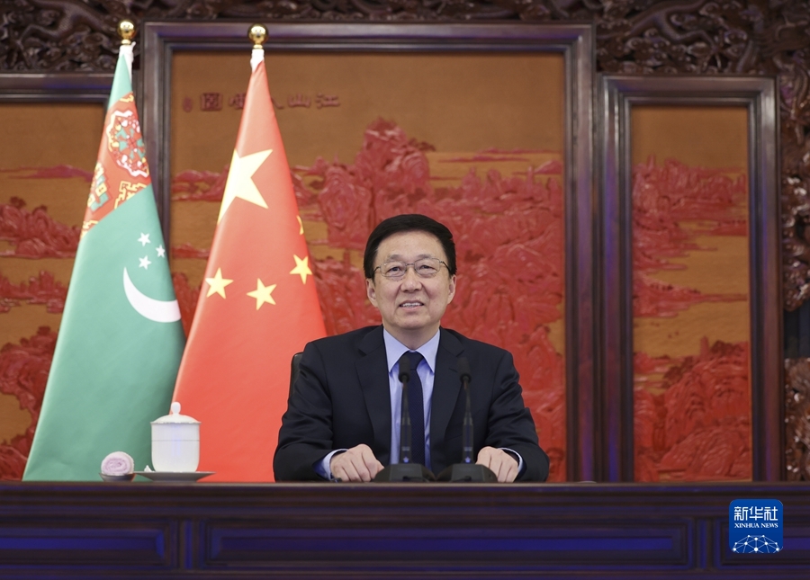 3月30日,中共中央政治局常委、国务院副总理、中土合作委员会中方主席韩正在北京通过视频方式会晤来华访问的土库曼斯坦副总理兼外长、中土合作委员会土方主席梅列多夫。新华社记者 丁海涛 摄