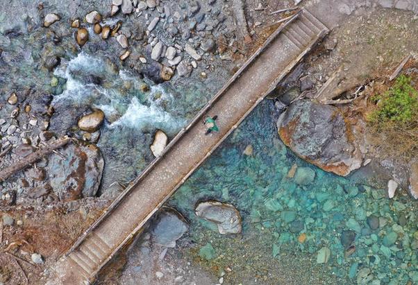 3月23日,何晓安在卧龙自然保护区内踩着石头过河。新华社记者 刘琼 摄