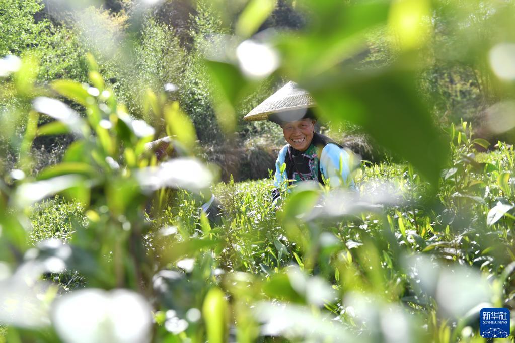 3月28日,幸福村的村民在采摘黄金茶。新华社记者 赵众志 摄