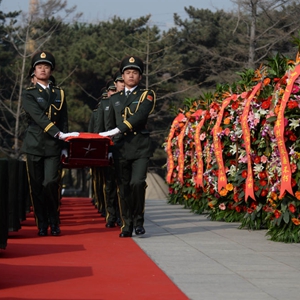 伴随着军乐队奏响《思念曲》,礼兵们抬起烈士棺椁,绕广场半周,缓缓走向安葬地宫。全场人员凝视着烈士棺椁,默默送别英雄。