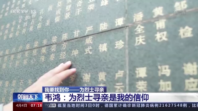 采访结束后,韦鸿告诉我们,每当把烈士的消息告诉他们的亲属,看到他们终于圆梦的时候,他越发觉得自己这份工作的神圣。而这些年在为烈士寻亲的过程中,他也逐渐明白,为烈士寻亲,寻找的不仅是一份团圆,更是一份甘愿舍弃小家甚至生命的人生信仰。他相信在各地退役军人事务部门的努力和社会力量的参与下,会有越来越多的烈士与亲人团圆。(总台记者 肖璞 何盈 崔霞 徐静 李宁 王洁 莫祥龙 吴天白)