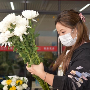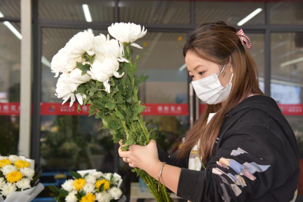 在众多花店中,赵蕊的花店颇受欢迎,早上8点摆上的近5000枝菊花,中午刚过就卖了一大半。“以往都得晚上9点关店,今天估计6点就能卖完回家咯。”她说。