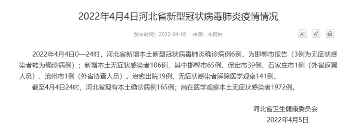 2022年4月4日0—24时,河北省新增本土新型冠状病毒肺炎确诊病例6例,为邯郸市报告(3例为无症状感染者转为确诊病例);新增本土无症状感染者106例,其中邯郸市65例、保定市39例、石家庄市1例(外省返冀人员)、沧州市1例(外省协查人员)。治愈出院19例,无症状感染者解除医学观察141例。