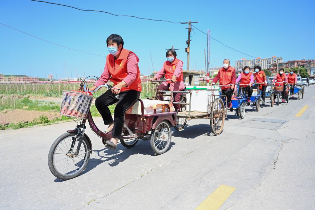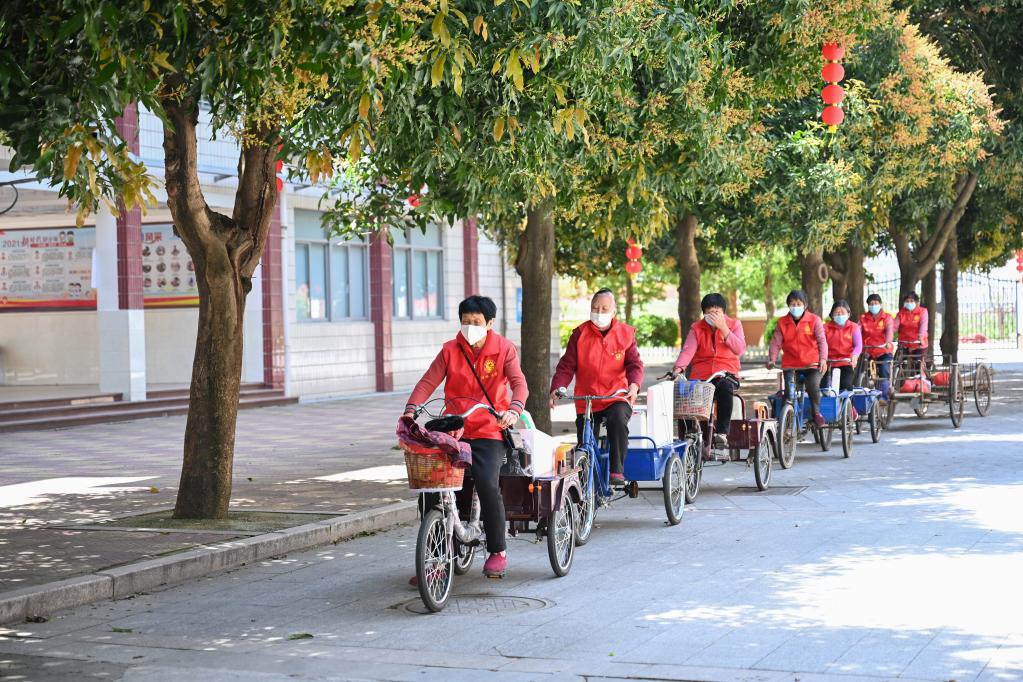 4月5日,在泉州市鲤城区浮桥街道新步社区,爱心厨房的阿嬷们骑三轮车配送午餐。新华社记者 周义 摄