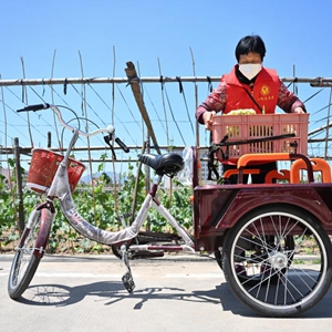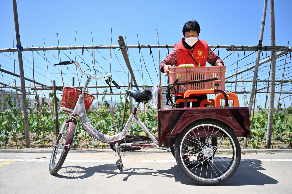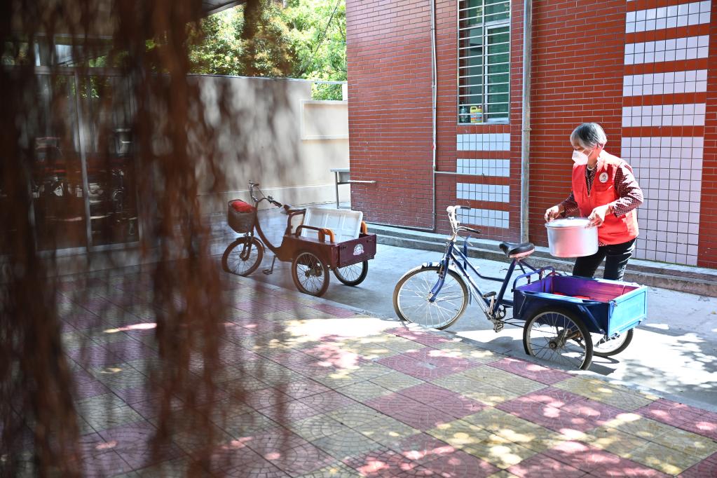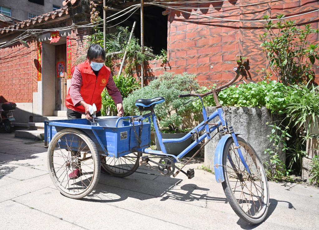 4月5日,在泉州市鲤城区浮桥街道新步社区,一位爱心厨房的阿嬷用三轮车装运暖心午餐。新华社记者 周义 摄