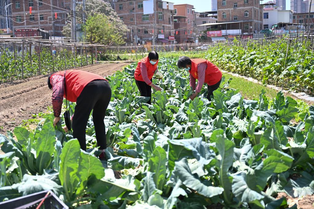 4月5日,在泉州市鲤城区浮桥街道新步社区,爱心厨房的阿嬷们在采摘蔬菜。新华社记者 周义 摄