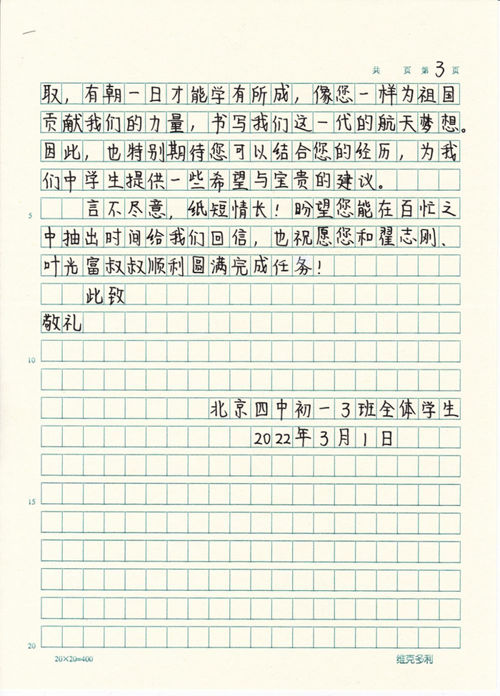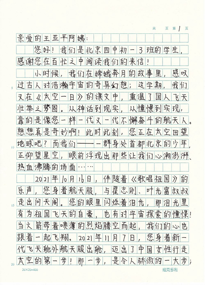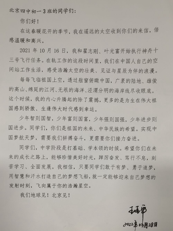 近日,北京四中初一3班的学生们收到了一封来自太空的回信。神舟十三号乘组航天员王亚平从跨越400公里的中国空间站与学生们分享浩瀚太空的壮美,畅谈航天梦。她鼓励学生们:用智慧和汗水打造自己的梦想飞船。