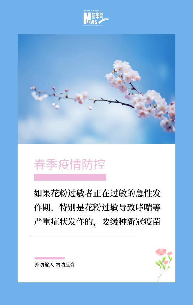 在4月6日举行的国务院联防联控机制新闻发布会上,中国疾控中心免疫规划首席专家王华庆明确,春季是花粉过敏的高峰期,有花粉过敏史不是接种新冠病毒疫苗的禁忌。只有接种新冠病毒疫苗过敏的或对新冠病毒疫苗中成分过敏或既往接种其他疫苗发生严重过敏的,才是接种新冠病毒疫苗的禁忌。