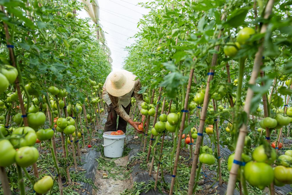 4月5日,嘉善县姚庄镇北港村村民孙夏飞正在采摘番茄。图片由嘉善县姚庄镇党建办提供