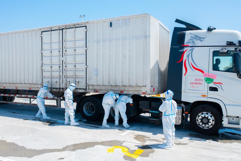 随后,满载这些物资包的货运卡车迅速驶往入沪前的最后一站——浙江省援沪防疫生活物资平湖中转站。只见货车驶入后,马上有身穿防护服的工作人员上前进行登记、消杀;随后司机将货车驶入“满载区”,卸下货箱;紧接着,接收方的货车司机将满载物资的货箱接走,运往上海市区。