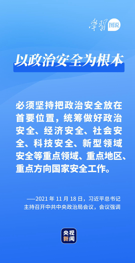 习近平总书记深刻指出,必须坚持总体国家安全观,以人民安全为宗旨,以政治安全为根本,以经济安全为基础,以军事、文化、社会安全为保障,以促进国际安全为依托,走出一条中国特色国家安全道路。