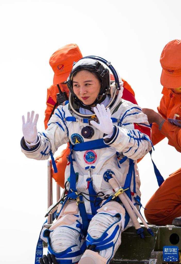 4月16日,神舟十三号载人飞船返回舱在东风着陆场成功着陆。这是航天员王亚平安全顺利出舱。新华社记者 连振 摄