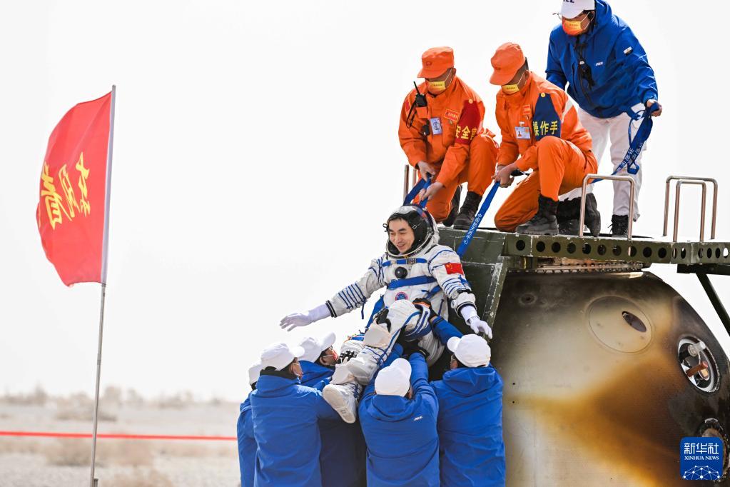 4月16日,神舟十三号载人飞船返回舱在东风着陆场成功着陆。这是航天员叶光富安全顺利出舱。新华社记者 连振 摄
