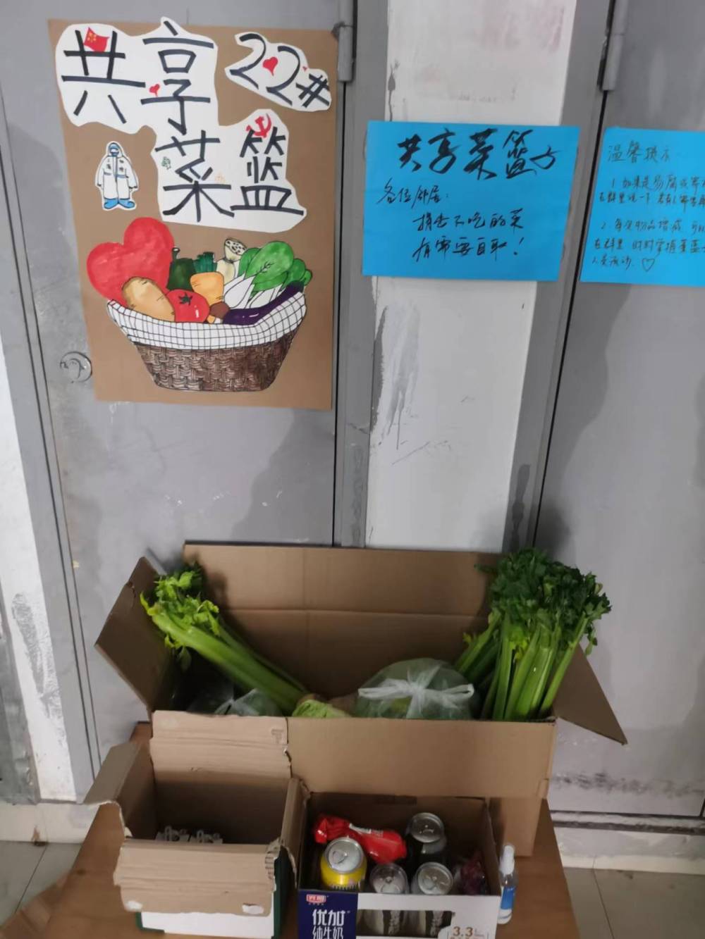 并附上“公告”:各位邻居,捐出不吃的菜,有需要自取!