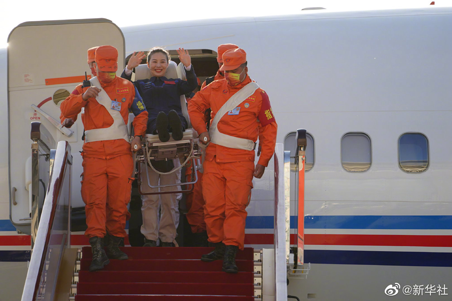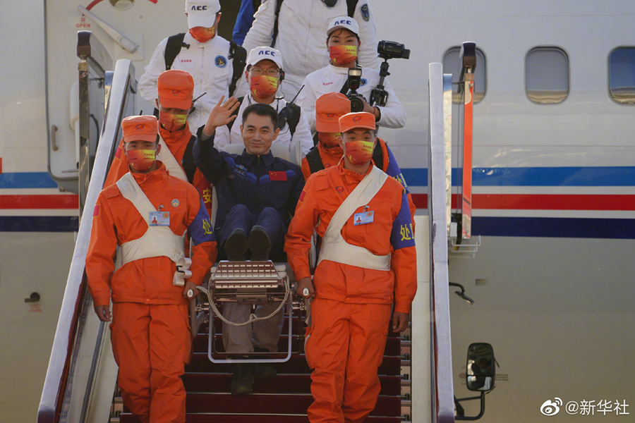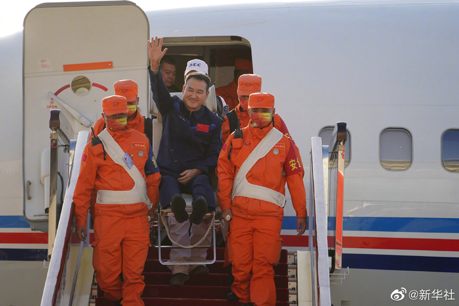 新华社北京4月16日电(记者郭明芝、田定宇)据中国载人航天工程办公室消息,圆满完成神舟十三号载人飞行任务的航天员翟志刚、王亚平、叶光富,于2022年4月16日下午乘坐任务飞机平安抵达北京。空间站阶段飞行任务总指挥部领导和成员到机场迎接。