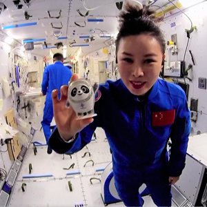 △“天宫课堂”中, 王亚平和“冰墩墩”在中国空间站同框。