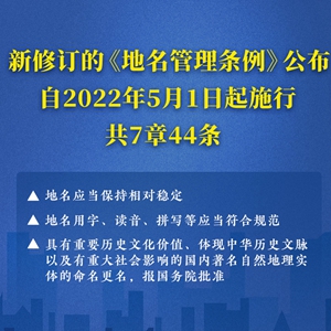 《地名管理条例》已于日前完成修订,自2022年5月1日起施行。修订后的条例共7章44条。其中,规定地名应当保持相对稳定;地名用字、读音、拼写等应当符合规范;具有重要历史文化价值、体现中华历史文脉以及有重大社会影响的国内著名自然地理实体的命名更名,报国务院批准。(记者高蕾,海报设计杨轶群)