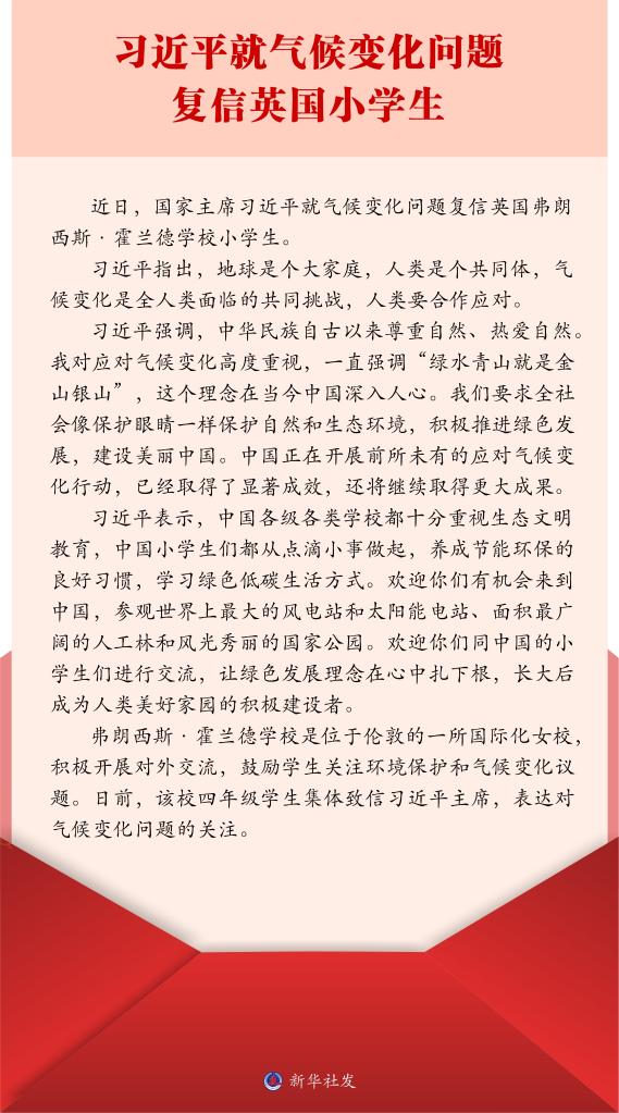 新华社北京4月21日电 近日,国家主席习近平就气候变化问题复信英国弗朗西斯·霍兰德学校小学生。