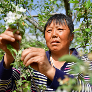 延安市宝塔区柳林镇孔家沟村村民在给苹果树疏花。新华社记者邵瑞摄