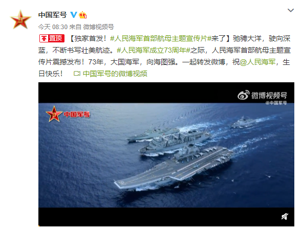 驰骋大洋,驶向深蓝,不断书写壮美航迹。人民海军成立73周年之际,人民海军首部航母主题宣传片震撼发布!73年,大国海军,向海图强。一起转发,祝人民海军,生日快乐!