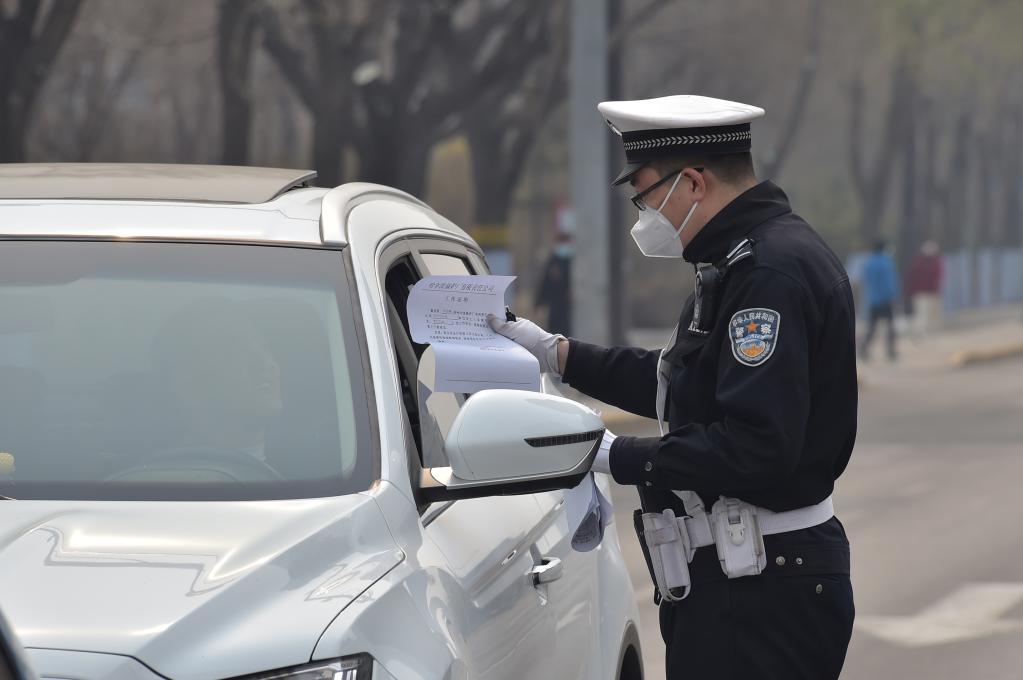4月21日,交警在哈尔滨市中山路上对过往车辆进行查验。新华社记者谢剑飞 摄
