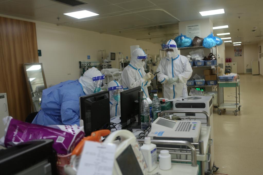 工作站内,身穿防护服、全副武装的医生护士正忙碌着:记录病人信息、接听工作电话、备药、整理器械;检查患者的生命体征、调整呼吸机参数;帮助病人适应俯卧位呼吸、翻身、检查调整补液速度、记录患者体温……