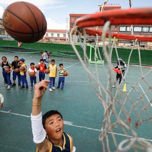 2020年6月14日,四川省阿坝藏族羌族自治州阿坝县民族寄宿制小学的学生在体育课上练习上篮。新华社记者沈伯韩摄